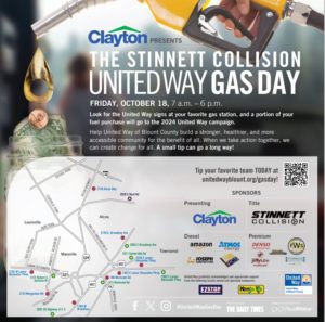Look for the United Way signs and banners at participating gas stations in Blount County, where you’ll find volunteers washing windshields and pumping gas for tips! Big thanks to Clayton for being the presenting sponsor of this event, and to Calloway and Downey Oil for supporting it!